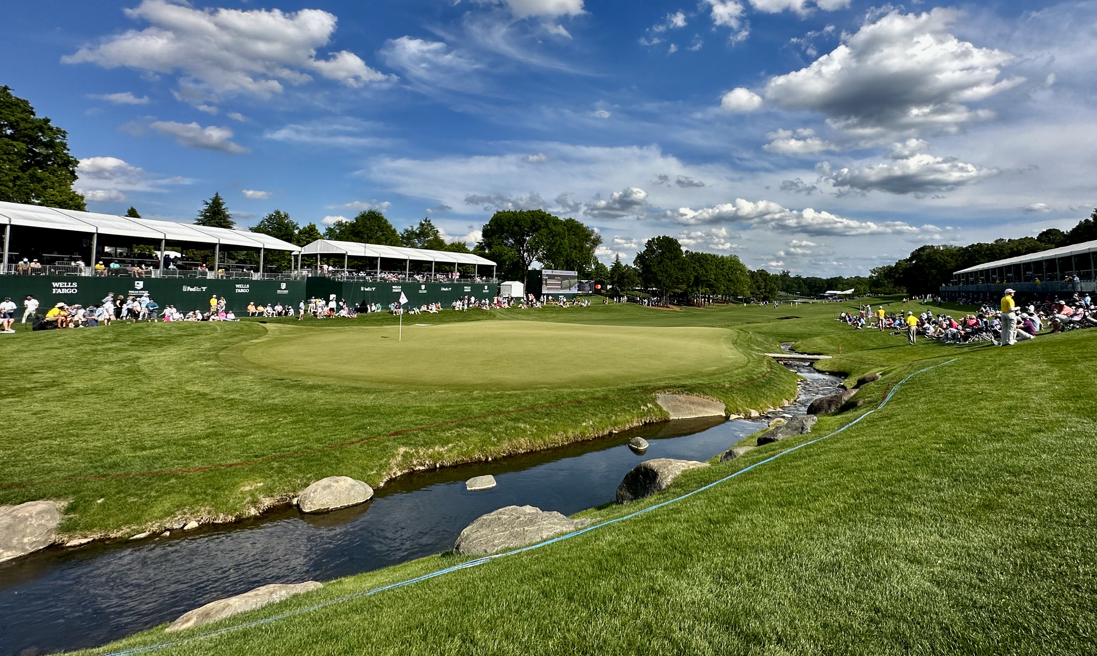 Quail Hollow Hole 18 – getting the Green Mile Club ready in the background for the 2017 PGA Championship